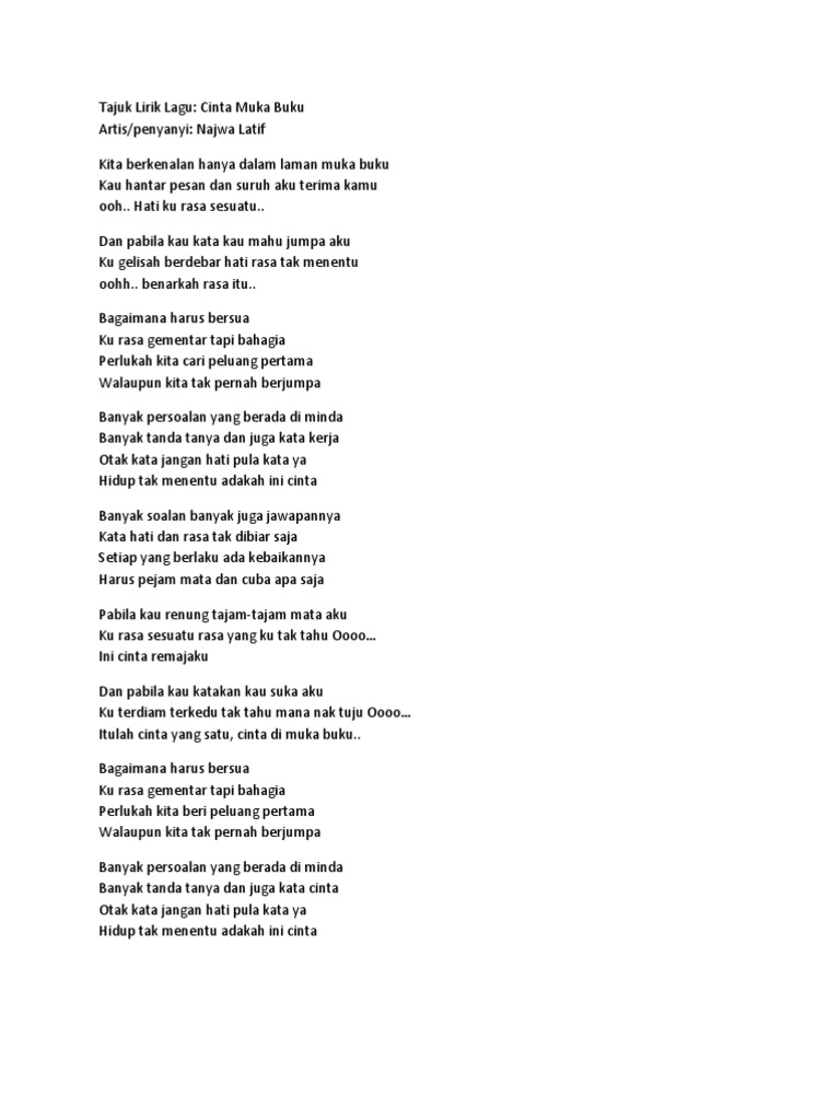 Berikut kutipan lirik lagunya aku hanyalah manusia biasa bisa merasakan sakit dan bahagia izinkan ku bicara agar. Najwa latif cinta muka buku official music video najwalatif. Kita berkenalan hanya dalam laman muka buku kau hantar petanda suruh aku terima kamu ooh. Dapat juga dengan mengeklik menu a b c d., lalu cari berdasarkan nama artis. chorus c g banyak persoalan yang berada di minda.